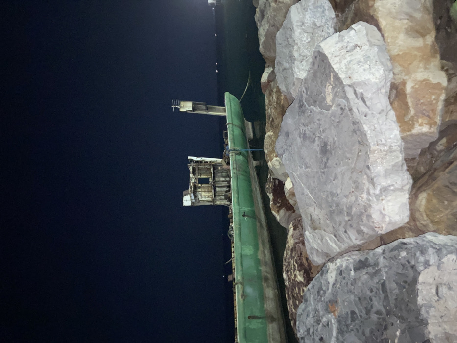 An evening shot shows a decaying, abandoned structure juxtaposed with large, roughly-hewn rocks. The structure, painted a weathered green, exhibits visible damage and is positioned near dark water. It's set against a dark, almost black, sky. The rocks, varying in color from tan to gray, fill the right side of the frame. The combination of the derelict structure and the imposing rocks creates a stark, lonely, yet striking visual.