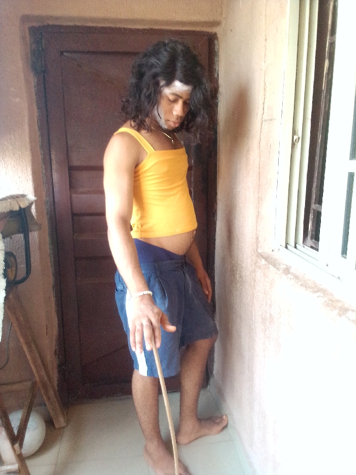 An individual is depicted standing indoors in Onitsha, Nigeria. The person, appearing male, has dark, wavy, shoulder-length hair and a light-colored beard, with a white substance applied across the forehead and upper cheeks. They are wearing a mustard yellow tank top exposing the midriff, dark blue shorts with a white vertical stripe on the left leg, a white beaded bracelet on the right wrist, and a thin gold-colored chain with a pendant. The individual is barefoot, standing upright with their head tilted downwards, looking towards the floor. A thin, light-colored wooden stick is held in the right hand, extending towards the floor. Behind the person is a dark brown wooden door with recessed panels. To the far left, a light-colored wooden folding structure and a white spherical object are partially visible on the floor. To the right, a light-colored, textured wall features a rectangular window with vertical white blinds or louvers. The floor is a light-colored tile.