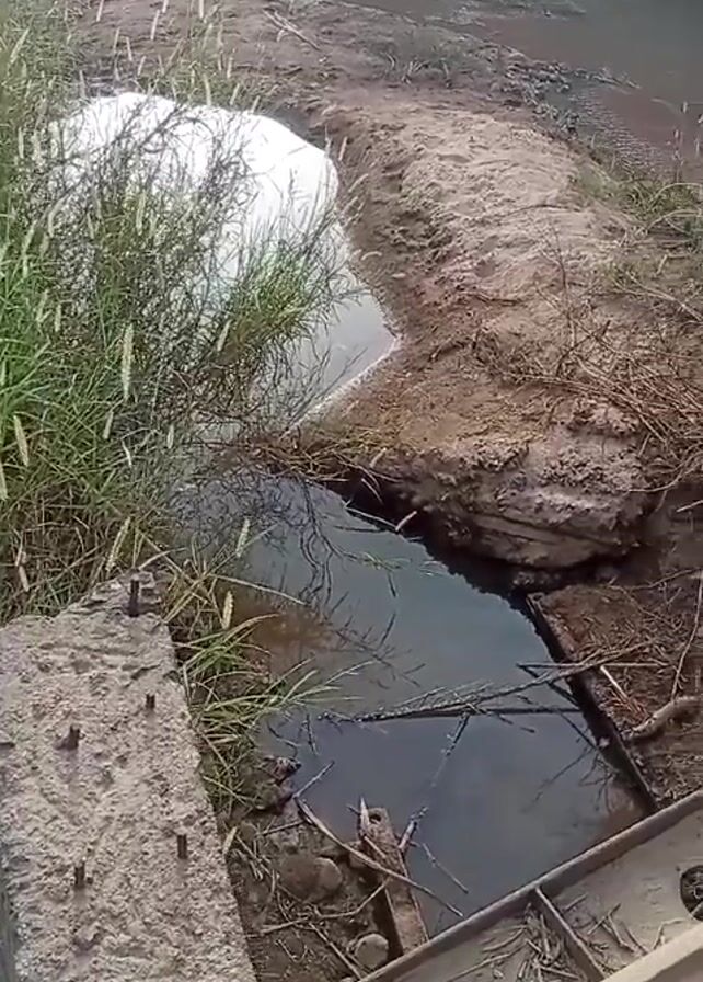 small, muddy river. The camera pans from a white object near the riverbank, over a rusted metal structure spanning the river, to the muddy water. Debris, including sticks and leaves, litters the riverbed and banks. The river water is murky. One person walks across the metal structure.