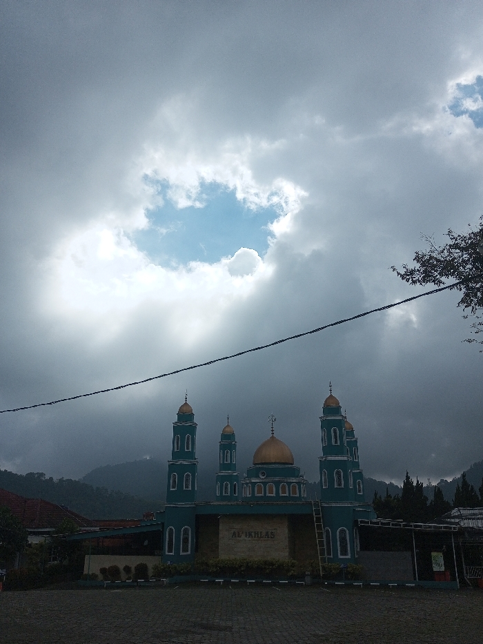The image displays an exterior view of a mosque, identified by a sign as "AL IKHLAS," situated in Lunugamwehera, Sri Lanka. The mosque is the central subject, featuring a prominent teal or turquoise main structure adorned with multiple golden domes and minaret tops. A large central golden dome caps the main building, flanked by four tall minarets, each terminating in a smaller golden dome. Two additional smaller domed structures are positioned on the mosque's roofline. The minarets are vertically segmented with arched window apertures. A rectangular sign with dark lettering, reading "AL IKHLAS," is mounted on the mosque's facade below the central dome. A light-colored ladder is propped against the right side of the mosque's facade. The sky is largely overcast with dense, grey clouds, but a distinct, irregularly shaped patch of blue sky with white cloud edges is visible in the upper-center. A dark electrical power line or cable stretches horizontally across the upper middle section of the frame, above the mosque. In the background to the left, dark green, tree-covered mountains or hills are present, partially obscured by atmospheric conditions. An adjacent building with a reddish-brown tiled roof is partially visible to the immediate left of the mosque. To the right, dark coniferous trees rise behind the structure. The foreground consists of a dark, paved surface, likely a courtyard, bordered by low, dark shrubbery at the base of the mosque. A dark, open-sided structure, possibly a kiosk or shelter, and a fence are partially visible to the far right. No individuals, actions, or interactions are present in the scene. The lighting is subdued, consistent with heavy cloud cover.