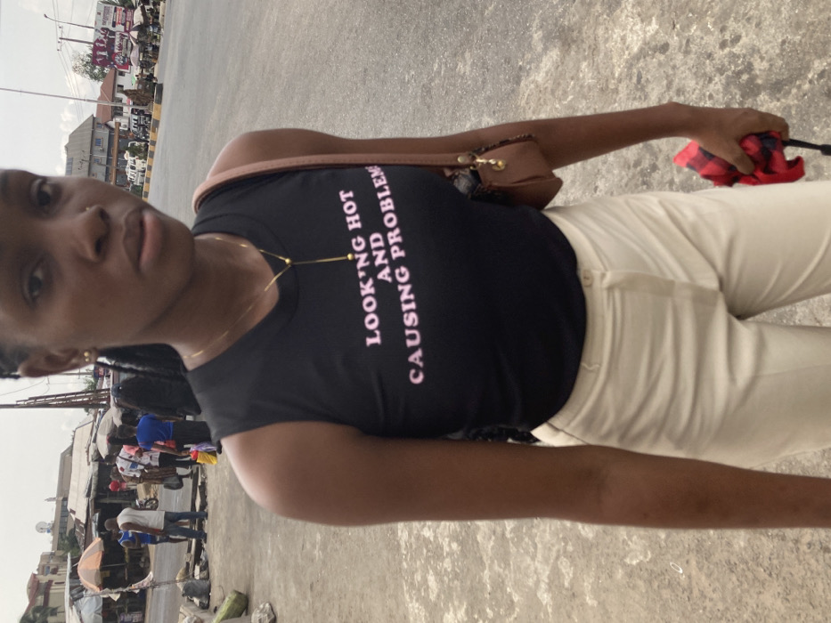 The image displays a young Black woman standing in the foreground of a street scene in Aba, Nigeria, under overcast daylight. She is positioned slightly right of center, looking directly at the viewer with a neutral expression. She wears a black sleeveless top bearing the pink text "LOOKING HOT AND CAUSING PROBLEM" across the chest, paired with light-colored (cream or khaki) tailored trousers. A gold lariat-style necklace is visible, along with a small gold stud earring in her visible right ear. A small, brown shoulder bag is slung over her right shoulder, and her right hand holds a crumpled red and black plaid item. The background shows a bustling urban environment. To the left, a paved area features several individuals, including a man in a blue shirt standing next to a white motorcycle. Behind them are market stalls with corrugated metal roofs and an orange umbrella. To the right, a wider paved road with a yellow curb marking extends into the distance, where additional buildings, utility poles, and white vans are visible. The overall scene suggests an active marketplace or commercial street.
