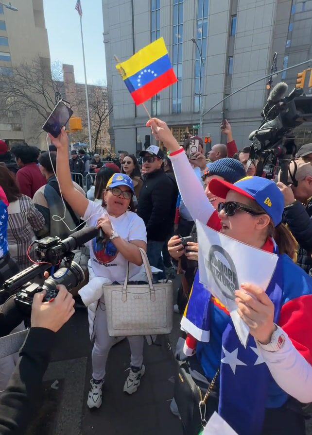 A crowd is protesting in an urban area, likely in New York City. The protestors wave Venezuelan flags and hold signs. Some signs read “NO MORE DICTATORS” and “PEACEFUL PROTEST FOR DEMOCRACY VENEZUELA Freedom & Justice.” A woman in a blue and red shirt with the DHL logo is visible in the foreground, waving a Venezuelan flag and holding a sign. There are also several people filming and photographing the demonstration. The mood appears to be spirited and determined.