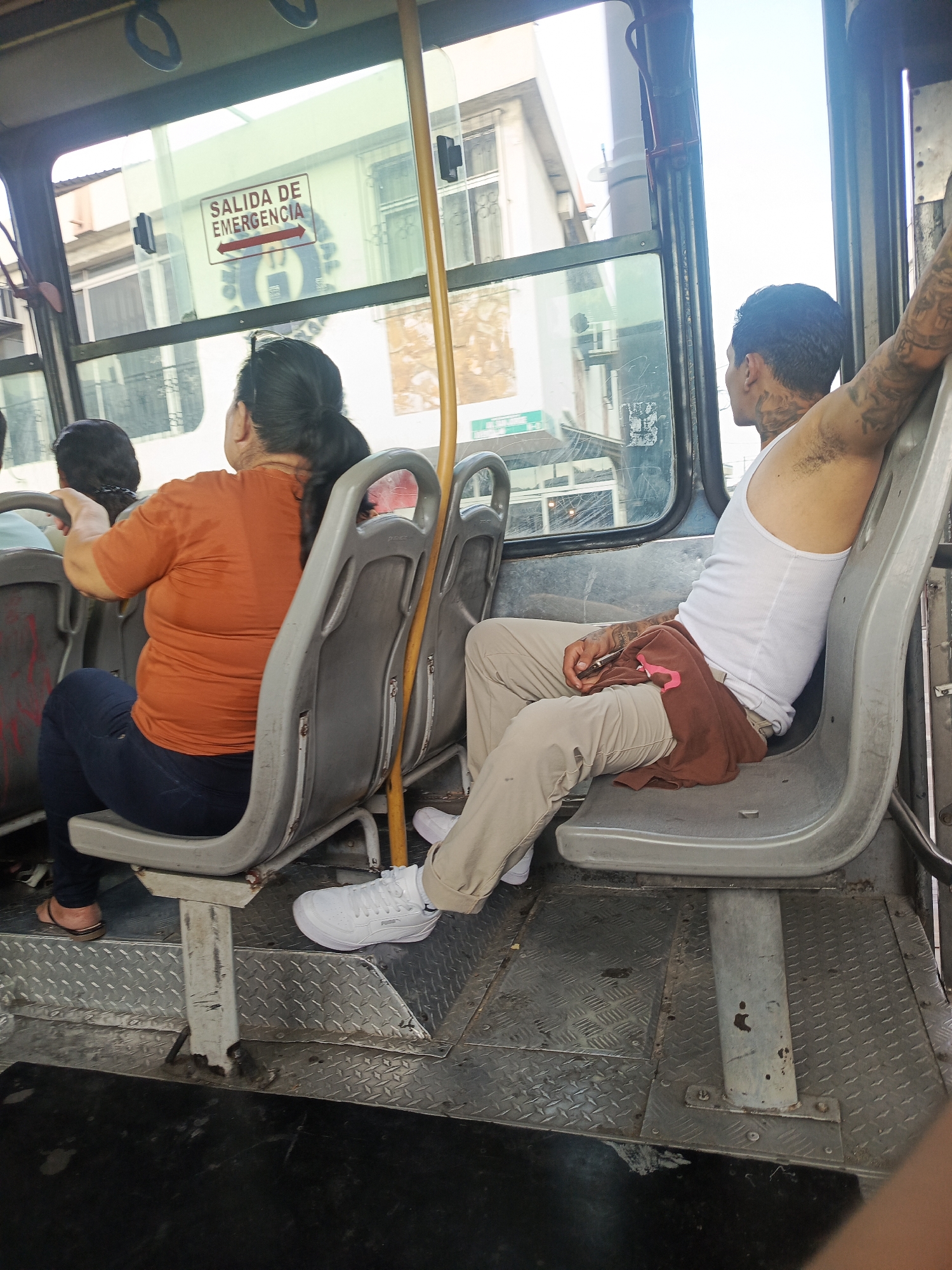 The photograph captures a scene inside a public bus in Guayaquil, Ecuador. The interior of the bus is worn with metal diamond plating on the floor. A woman in an orange shirt and blue jeans sits on a gray plastic seat. In the seat next to her, a man wearing a white tank top and khaki pants sits with his arm resting on the back of the seat. The man has multiple tattoos on his arm, neck, and chest. A brown shirt or cloth rests on his lap. Through the bus window, an "Emergency Exit" sign in Spanish is visible on a building across the street.