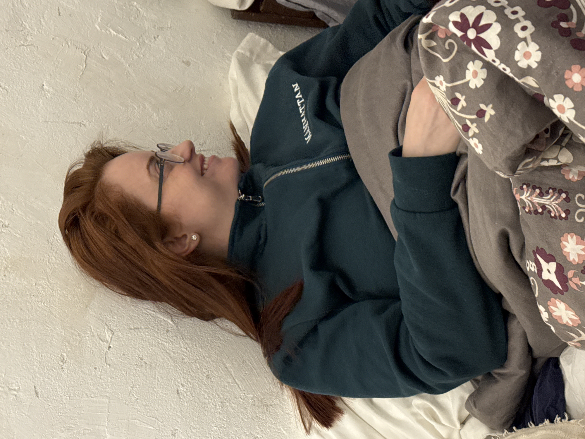 An adult female is depicted indoors, reclining against a textured, off-white wall. She has reddish-brown hair, fair skin, and wears dark-rimmed eyeglasses. A small, clear stud earring is present in her visible left ear. Her lips are curved into a smile, and her head is turned, with her gaze directed towards the viewer's right. She is dressed in a dark teal full-zip jacket featuring a silver zipper and "MANHATTAN" embroidered in white on the left chest. Her lower body is covered by a plain brown blanket, topped by a patterned fabric displaying white, pink, and burgundy floral motifs on a brown background. White bedding is visible behind and to her left, with a dark wooden object partially visible on the far right. The specific location within the City of Unknown, Unknown, is an indeterminate indoor setting.