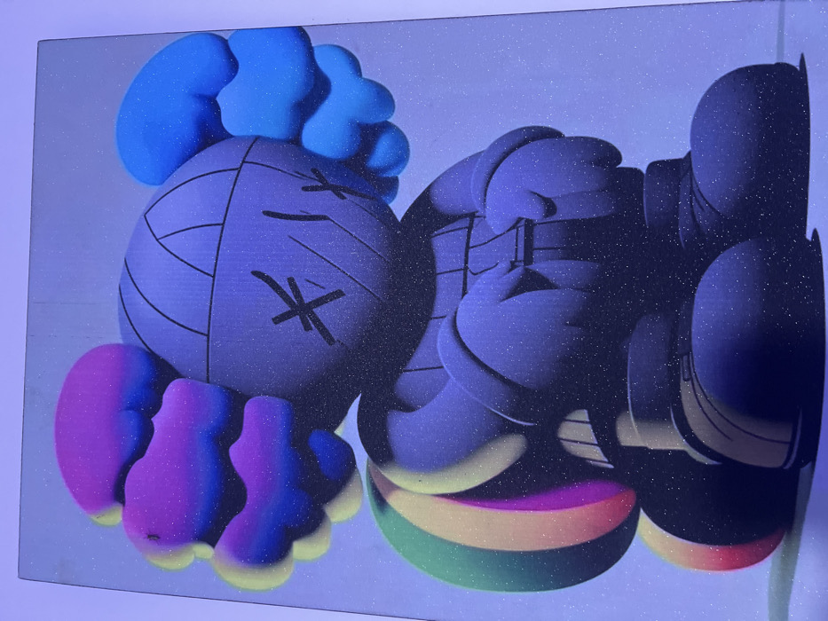 The artwork features two cartoon-like figures against a muted, slightly shimmering backdrop. One figure resembles a stylized head with crossed-out eyes and stitch details, topped with blue, cloud-like shapes and a purple and blue body. The other figure is a larger, more complex form resting on its side. This one appears to have limbs and wears what looks like a pair of shoes. A colorful striped section is visible, possibly the bottom of the figure. The overall impression is modern and pop-art influenced, with a slightly dreamlike quality.