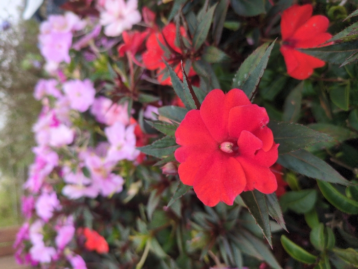 The image presents a close-up, ground-level view of a vibrant red flower, identified as an Impatiens (Busy Lizzie), located in the city of Phát Chi, Vietnam. The foreground flower is in sharp focus, displaying five distinct petals of a uniform red hue and a light-colored central reproductive structure. Dark green, ovate leaves with finely serrated edges frame the red bloom. The background consists of a dense, out-of-focus array of similar flowers, predominantly appearing in shades of pink, lavender, and lighter red, indicating a cultivated garden or flower bed environment. No individuals or specific actions are visible within the frame.