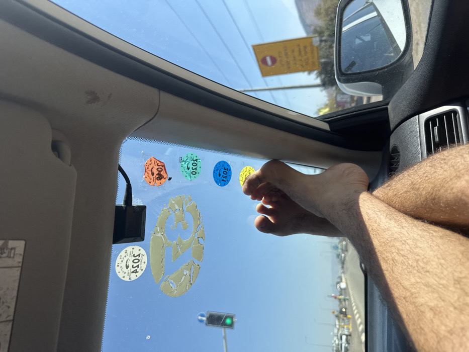 The image depicts an interior view from a vehicle on a clear, sunny day within the Gilboa Regional Council, Israel. A person's bare, hairy legs are propped up on the dashboard, with their feet crossed at the ankles and resting against the lower windshield. The vehicle's interior features a black dashboard with a visible air vent. A dashcam is mounted on the windshield, connected by a cable. The windshield is adorned with multiple stickers, including a large, partially peeled light-colored sticker, and several smaller, circular vehicle inspection/registration stickers, some displaying years such as "2021" and "2023" in Hebrew or Gregorian format. Beyond the windshield, a multi-lane road with active traffic is visible. A traffic light on the left displays a green signal. Utility poles and lines traverse the clear blue sky. On the right, a yellow road sign with a red circular prohibitory symbol and Hebrew text is partially visible. Hills or mountains form the distant background. The vehicle's passenger-side mirror is also visible on the right.