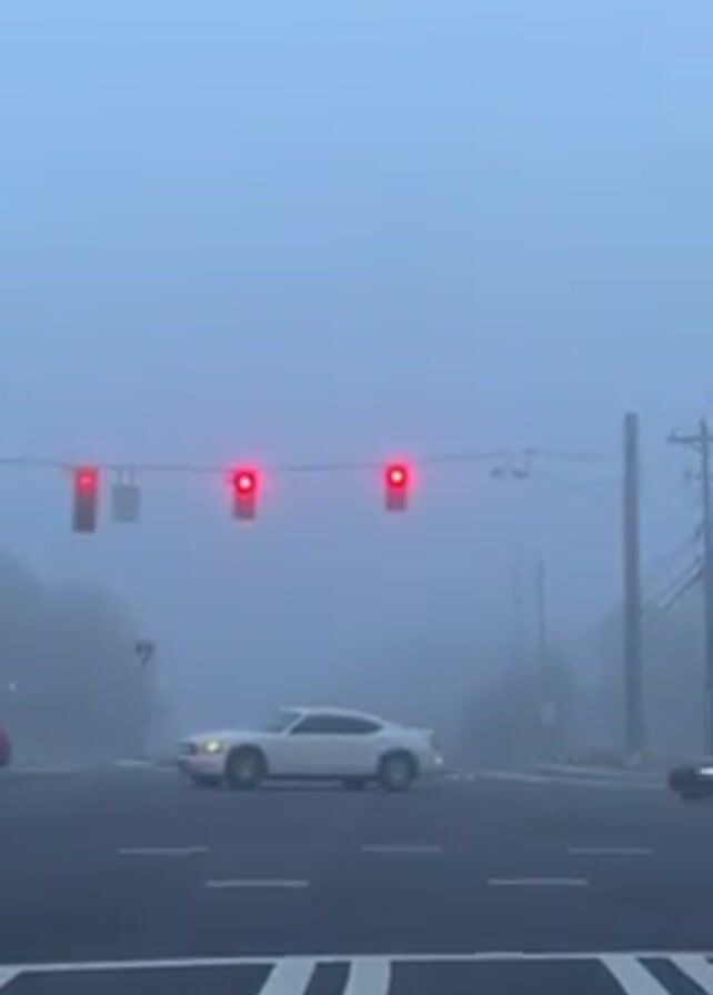 n intersection on a foggy day with red traffic lights. Several cars pass through the intersection. There are trees and utility poles visible in the background, obscured by fog.