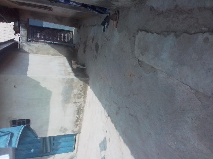 A concrete courtyard is shown with light-colored walls. A tan dog stands near the wall. A blue door is visible along with a window. A second window is located higher on the wall. A set of shoes rests on the concrete. The space appears shaded and exposed to the elements. The concrete ground shows variations in tone and surface.