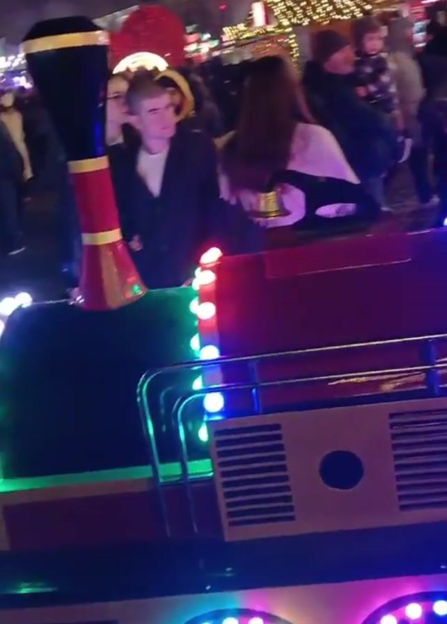 brightly lit, miniature train moving through a crowded outdoor space at night. The train is decorated with numerous colorful lights, including blue, red, green, and white. The train carriages are painted in different colors like red, black, and green, each with gold accents. People are seated inside the carriages, and other individuals are seen standing around the train, including a man in a black jacket walking past. The background is filled with other lights and structures, indicating a festive or amusement park atmosphere. The camera pans along the train, showing its design and the people inside. The ground is paved with cobblestones. The lights create a vibrant and lively scene.