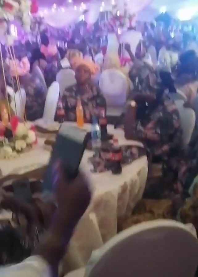 crowded event, likely a wedding reception, based on the décor and attire of the attendees. The room is decorated with white fabric draped across the ceiling, with floral centerpieces and lighting effects. Tables are set with plates, drinks, and other items. People are seated, dressed in colorful clothing and headwraps, common in West African celebrations. Some people move around, adding to the bustling atmosphere of the event. The lighting includes a mix of white and purple hues, creating a festive ambiance.