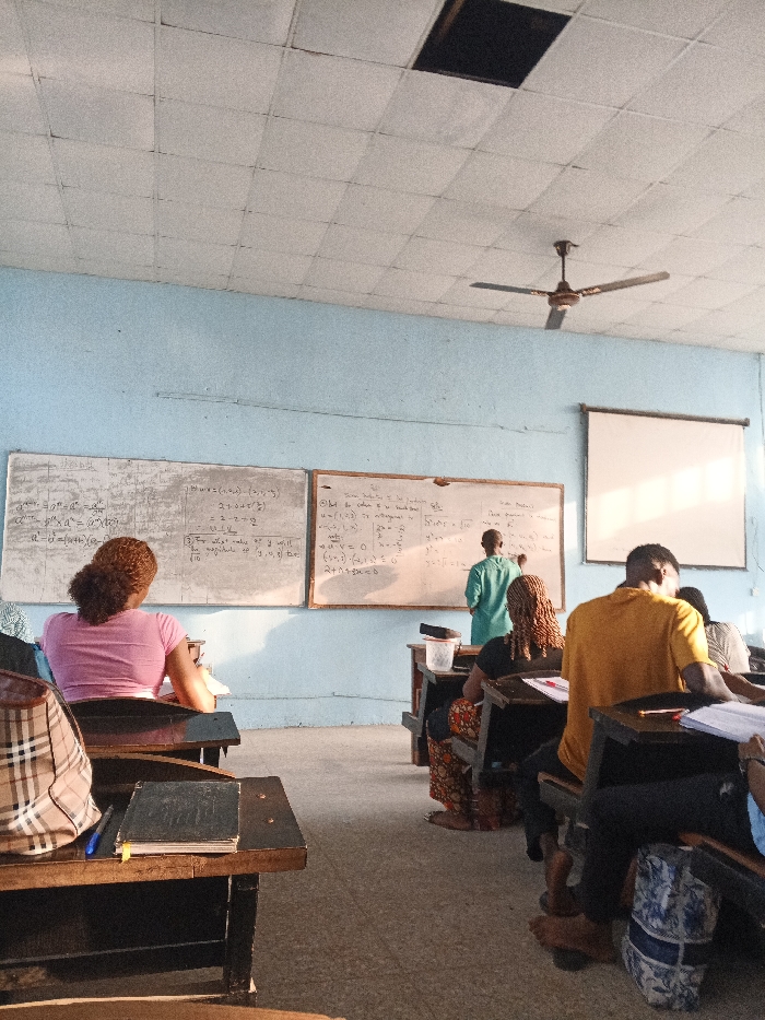 The scene depicts a classroom in Ukukwa, Nigeria. The room features light blue walls, a white tiled ceiling with one dark, square opening from a missing tile, and a four-bladed brown ceiling fan. The floor is composed of light-colored tiles. At the front, three whiteboards are present; the two on the left are covered with handwritten mathematical equations and text, while the rightmost is a blank white surface, possibly a projector screen. An individual, likely an instructor, stands at the far-right whiteboard, facing it, and is actively writing. This person is dressed in a light green tunic. Several students are seated at dark brown wooden desks with integrated chairs, facing the front. In the foreground on the left, a student with reddish-brown curly hair, wearing a pink top, is seen from behind. A plaid-patterned bag rests on a desk beside them, and a dark notebook is visible on their desk. Further to the right, other students are partially visible from behind, including one wearing a yellow t-shirt and another in a dark top with a patterned lower garment. Natural light enters the room, illuminating the right side of the classroom.
