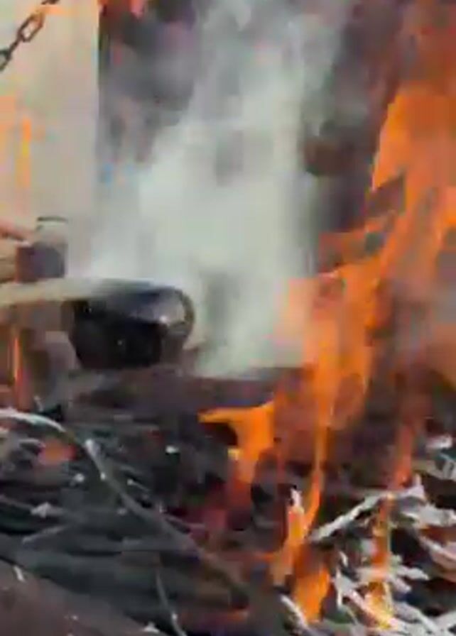 pot of something on a fire. The fire is contained within a metal structure with a chain hanging down. There is a large amount of white smoke billowing from the pot. The fire is fueled by an assortment of sticks and other dry materials.