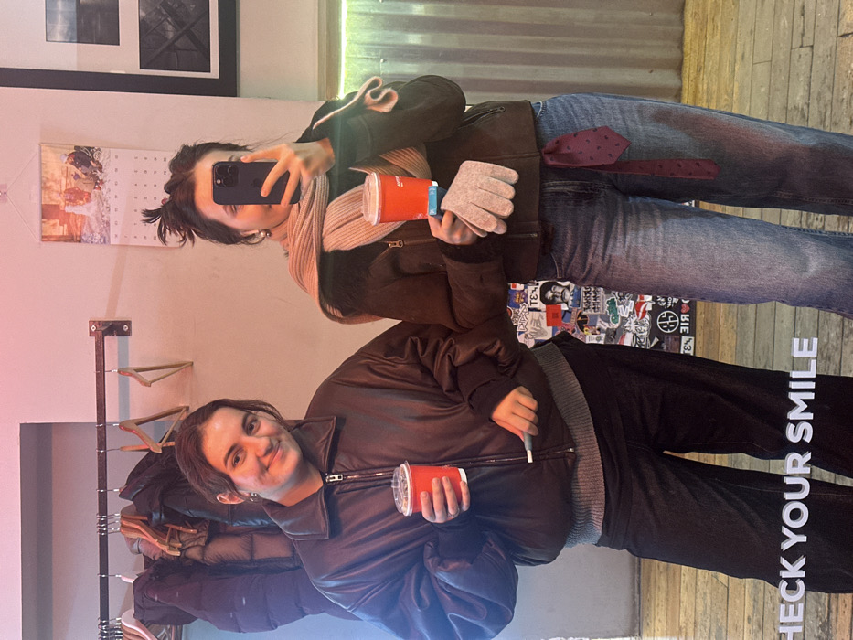 The image depicts two young adult females captured in a mirror selfie within an indoor establishment in Moscow, Russia. The left subject, with dark hair, smiles slightly while holding a red beverage cup with a clear lid in her left hand and a white cylindrical object in her right. She wears an oversized dark brown leather bomber jacket over a grey ribbed sweater and dark pants. The right subject, with dark hair tied up, holds a black smartphone to capture the selfie, partially obscuring her face. She wears a dark brown jacket, a light beige ribbed scarf, blue jeans, and holds a red beverage cup with a clear lid in her left hand, along with a light grey glove. A burgundy patterned tie hangs from her right hip. The background includes a light-colored wall with a metal clothes rack holding several dark jackets and empty wooden hangers. To the right, a wall calendar with a winter scene is visible above a segment of wall covered in various stickers, including a stylized face. A framed dark artwork or photograph is on the far right wall, next to a vertical green LED light strip. The floor, made of light-colored wood, displays the text "CHECK YOUR SMILE" in white lettering towards the bottom of the frame. The overall lighting casts a warm, slightly pink hue on the scene.