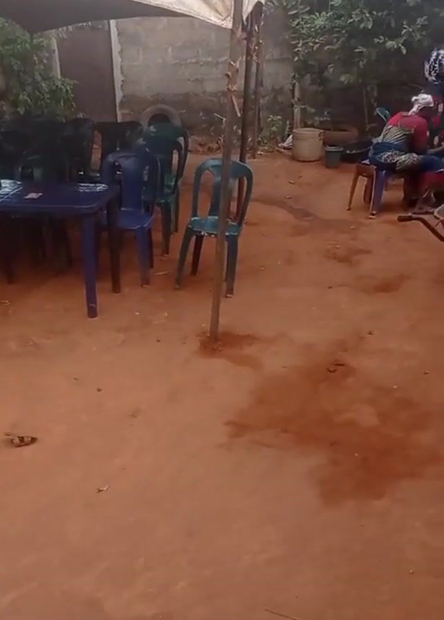 n outdoor gathering in a rustic setting. There is a makeshift tent providing cover over several plastic tables and chairs. Around the tables and chairs are several young children, some sitting and some standing. Behind them, women are working near a smoky cooking area, handling containers and preparing food. The ground is bare earth. The video is shot from a slightly low angle, panning across the scene.