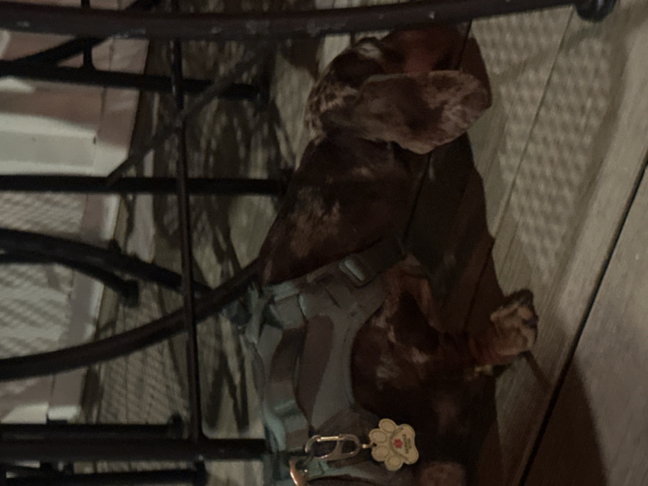 A brown and white mottled dog with a grey harness stands near a metal staircase