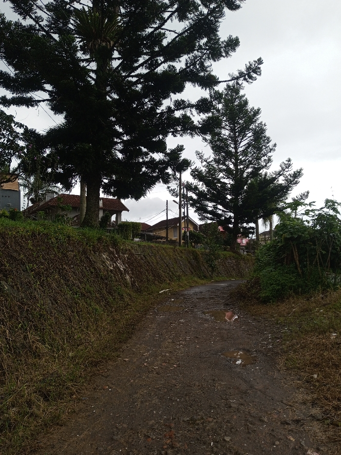 A narrow, muddy path winds its way uphill, flanked by grassy slopes and scattered vegetation. Tall, dark trees cast shadows over the scene. Residential buildings with red-tiled roofs are partially visible in the background, obscured by the dense foliage. Utility poles and wires are strung across the sky, which is overcast with gray clouds. The overall atmosphere suggests a rural or semi-rural setting, possibly after a recent rain.