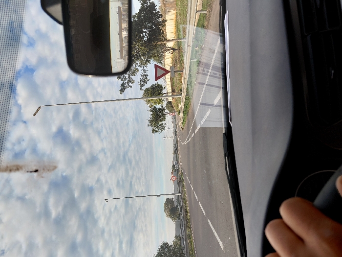 The image depicts a daytime scene from inside a vehicle, looking forward through the windshield onto a road in Mohammedia, Morocco. In the foreground, a dark dashboard occupies the lower portion of the frame, with a right hand gripping a steering wheel visible on the left. A rearview mirror is partially visible on the right, reflecting parts of the sky and distant structures. The windshield exhibits a smudge or dirt mark near the top-center. The road ahead is a two-lane asphalt surface with white dashed lane markings and solid white shoulder lines. It appears to curve gently to the right in the distance. Metal guardrails line both sides of the road. On the right side of the road, a prominent red-bordered triangular "Yield" sign is visible, followed by what appears to be a rectangular white sign with text. Further down the road on the left, a circular red "No Entry" sign is identifiable. The environment includes scattered green trees and shrubs along both sides of the road, beyond the guardrails. Two tall streetlights with horizontal fixtures are positioned on either side of the road, extending towards the sky. In the mid-distance on the right, low, light-colored walls or structures are present. The background shows a cloudy sky with scattered cumulus clouds. Distant structures or buildings are faintly visible on the horizon.