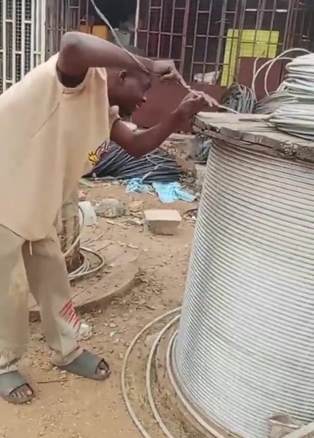 A man stands next to a large spool of white cabling and appears to be cutting or manipulating the wire on top of the spool. He is wearing a light beige shirt, khaki pants with red stripes, and slides. The spool of cabling is situated outdoors on dirt and rock. Behind him is a building with barred windows. Additional rolls of black and white cabling are on the ground nearby.