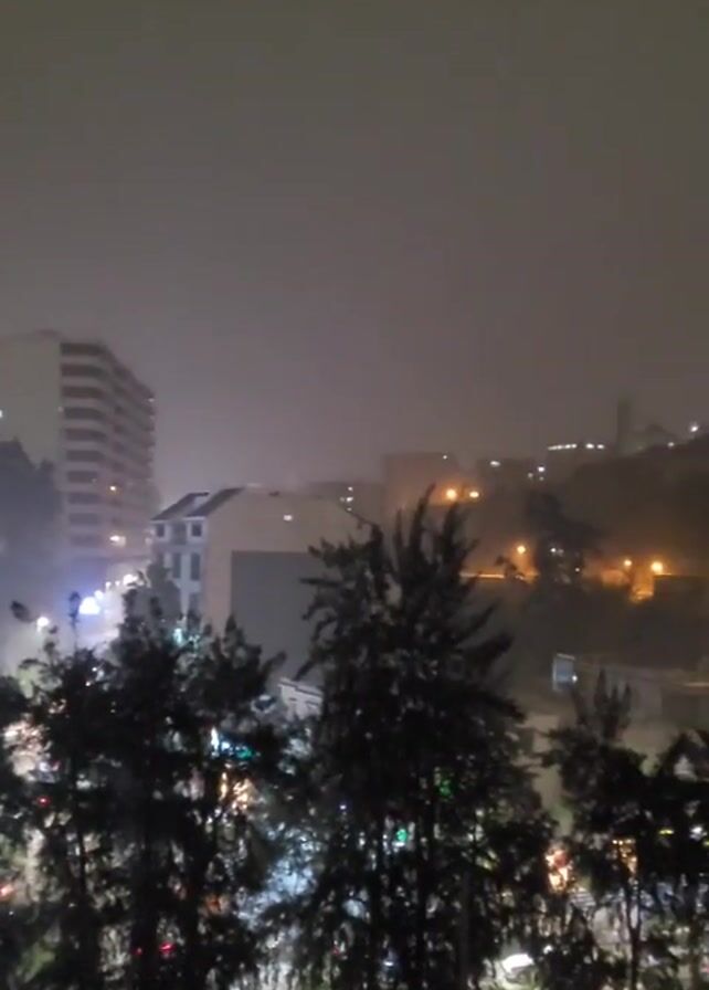 cityscape at night during heavy rain. Silhouetted trees stand in the foreground, decorated with some colorful lights. Behind them are buildings of varying heights, with lights scattered around. The rain creates a hazy effect, obscuring distant details. The sky is overcast.