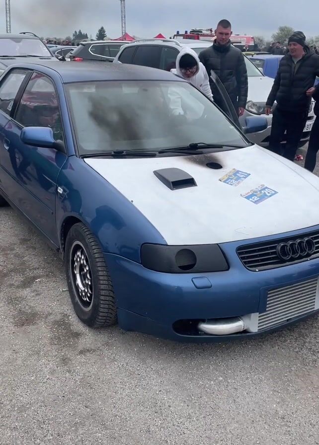 A blue Audi A3 is parked outside, with a white hood that has a large vent. The hood also has soot marks and event stickers on it. The front bumper is modified with an intercooler installed. People are gathered around the car, and black smoke is billowing from the vent on the hood. A popping noise is heard repeatedly. The setting appears to be a gathering of car enthusiasts.