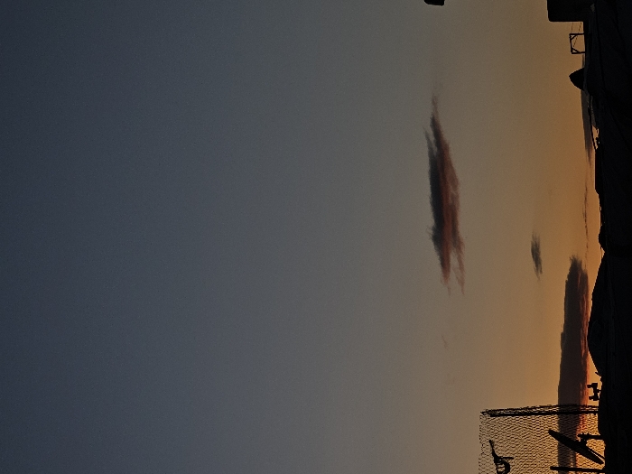 The image depicts a transitional sky, likely at dusk or dawn, over the city of Fez, Morocco. The upper sky is a dark blue-grey, gradually transitioning to orange and yellow hues at the horizon line. Several elongated, dark clouds are present, with one prominent cloud in the upper-middle exhibiting reddish-orange coloration on its underside. Silhouetted against the vibrant horizon on the left is a tall, dark structure resembling a chain-link fence, with a satellite dish visible below it. The silhouette of a city skyline stretches across the lower portion of the frame, showing uneven rooftops and various architectural structures, including what appears to be a small, open framework on a rooftop to the right. No individuals, specific actions, or direct interactions are discernible within the scene.