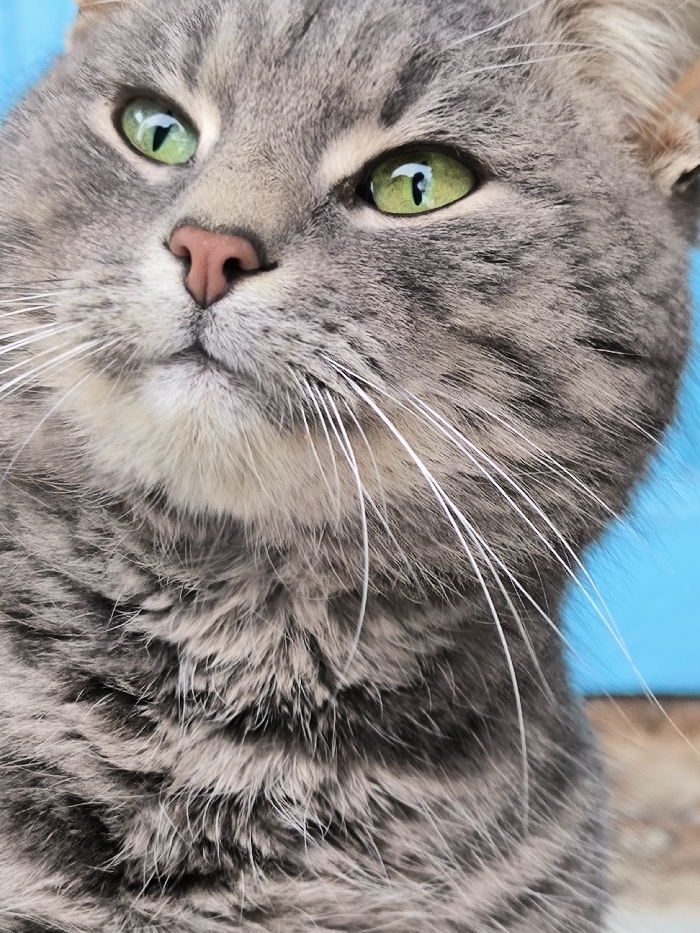 - "A close-up portrait, originating from Parkhomivka, Ukraine, depicts the head and upper chest of a grey tabby cat" by FM-dWhzM2, licensed under CC BY 4.0