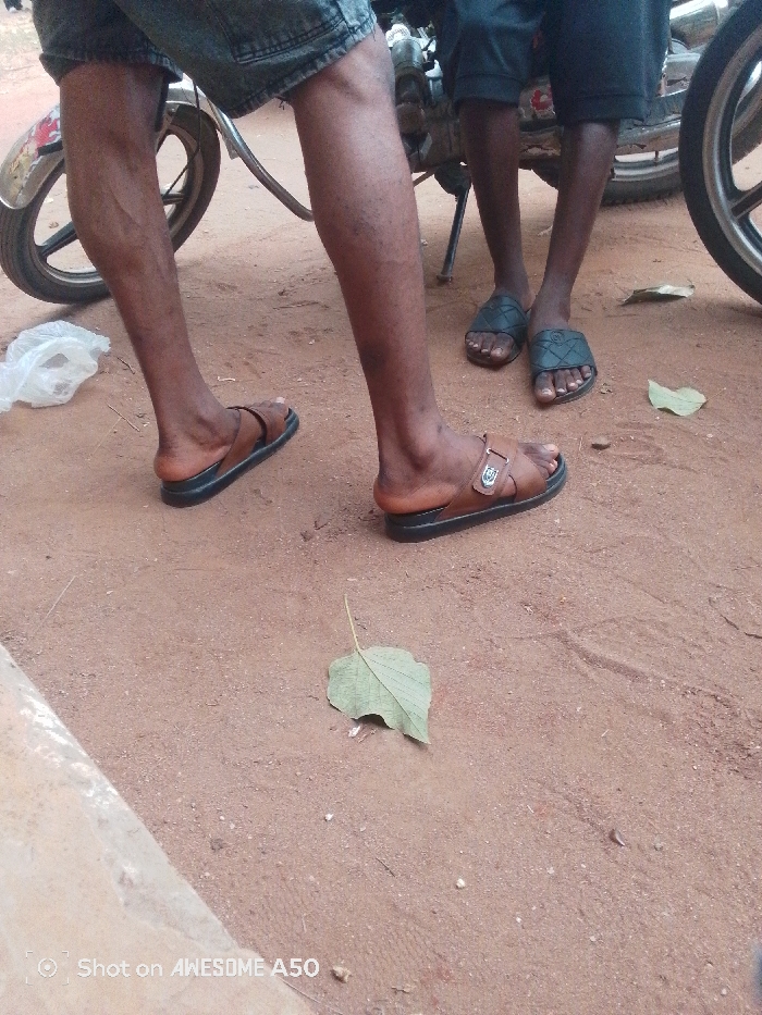Two people stand near a parked motorcycle. Both are wearing open-toed sandals and casual shorts. The person on the left wears denim shorts and brown leather sandals. The person on the right is dressed in dark shorts and black sandals. A plastic bag and a leaf are on the reddish-brown ground. The scene appears to be captured outdoors during daylight.
