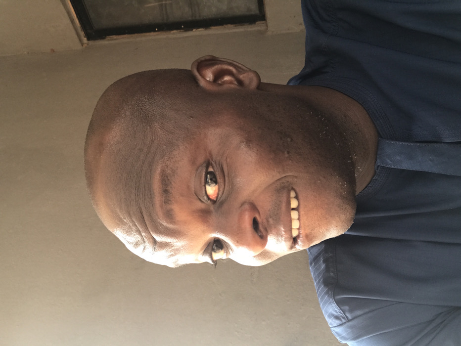 An indoor close-up portrait features an adult male of African descent, with a dark complexion and a closely shaved head