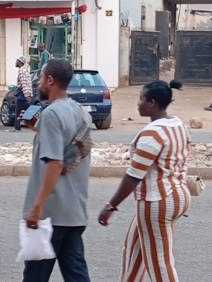 Two people walk along a street. The person on the left is a man with a gray shirt, dark pants, and a shoulder bag. He's holding a smartphone and a white plastic bag. The person on the right is a woman wearing a striped brown and white pantsuit with a small ponytail. A dark blue Volkswagen car is visible behind them, parked near a storefront with open doors. The building next to the store is painted white and displays the number "22". A black metal gate stands nearby.