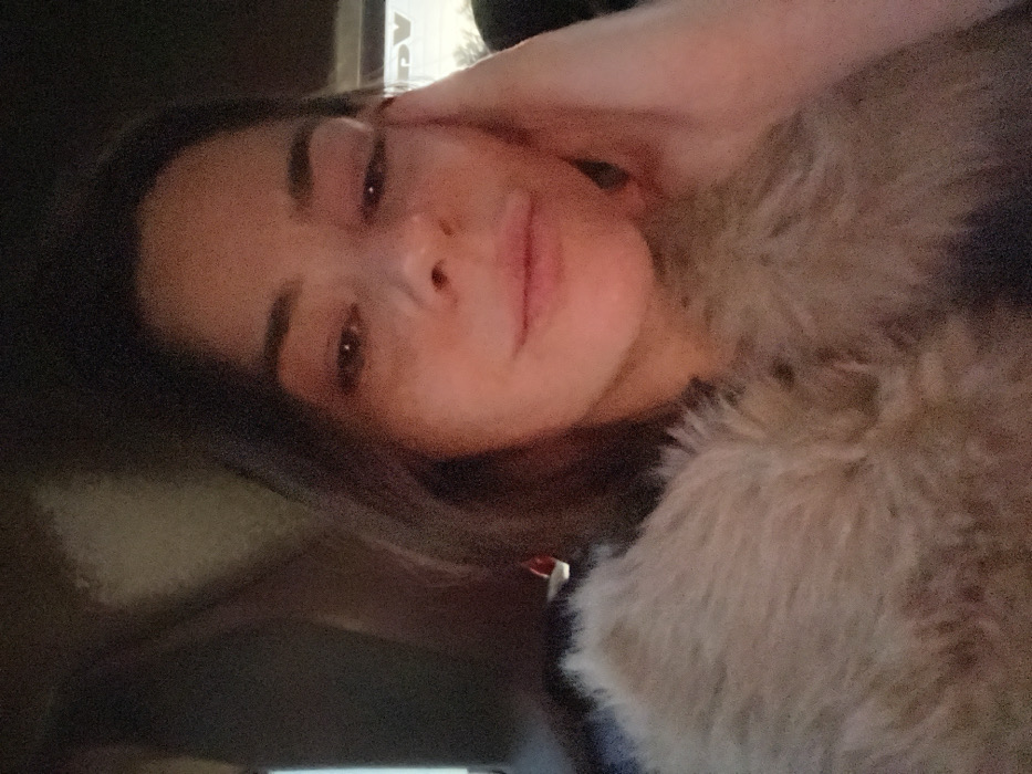 The image depicts a single female subject, approximately 20-35 years old, with dark hair, dark eyebrows, and a fair complexion. She is seen from the chest up, positioned slightly off-center to the left, looking directly into the camera with a neutral expression and slightly parted lips. Her left hand is raised, with fingers resting against her right cheek/jawline. She is wearing a light tan or beige fluffy, possibly faux-fur, collar over a darker garment, which appears to be a jacket or coat. A reddish, possibly reflective, object is visible near her left shoulder. The background is dark and out of focus, suggesting an indoor setting or the interior of a vehicle during low light conditions. A blurred light source or reflection is faintly visible in the upper right background. The specific location within the city of Colombes, France, is not identifiable from the provided image.