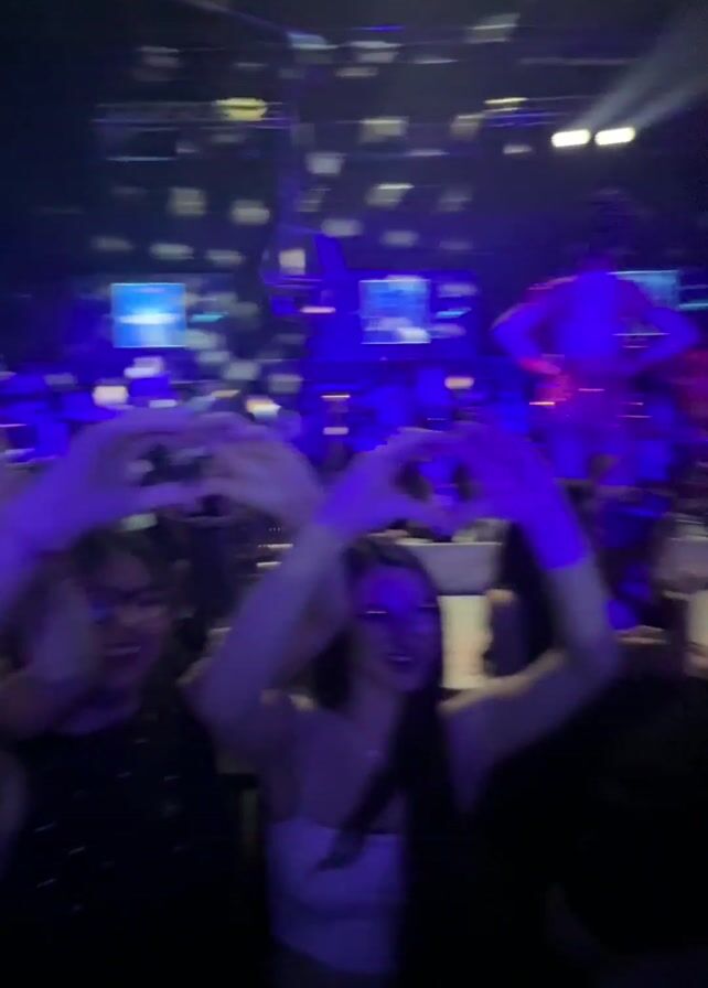 concert with a singer performing on stage in front of a crowd. Initially, three young women are seen in the foreground making heart shapes with their hands, indicating their enjoyment of the event. The camera then pans over the audience to the stage where the singer is under blue lighting with moving lasers and spotlights. There are multiple video screens in the background displaying abstract images. The singer is wearing a black shirt and pants, and is holding a microphone while singing. The audience appears to be enjoying the show.