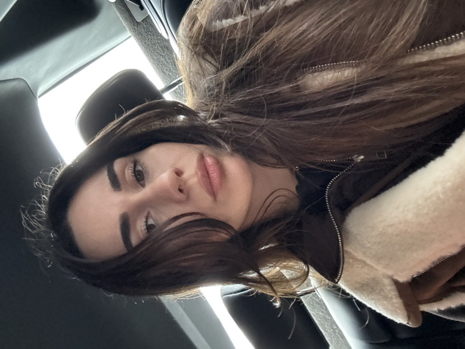 The image captures a female individual from the chest up, positioned inside the passenger compartment of a vehicle, likely in the back seat