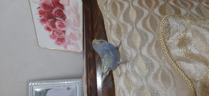 A small blue and yellow parakeet clings to the edge of an ornate, shimmering, golden-patterned curtain. Its small legs are gripping the fabric. To the left, a dark wood frame separates the curtain from a wall. The wall holds a picture of pink roses. Below the rose picture, a silver framed picture rests on the wall. The curtain takes up the majority of the right portion of the frame.