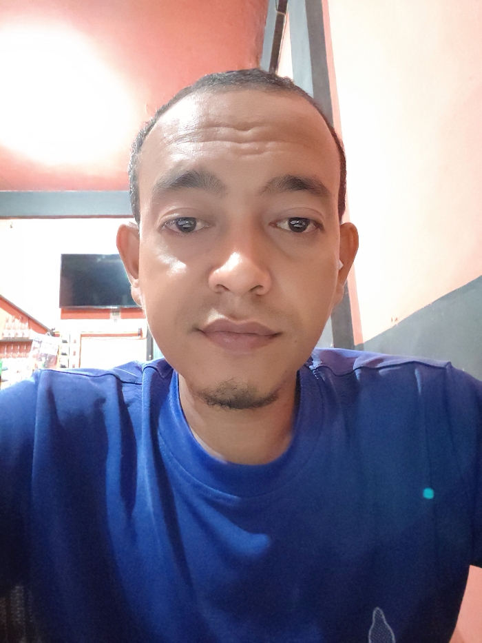 A male individual is depicted in a close-up, chest-up shot. He possesses short, dark hair, dark eyes, a visible goatee, and prominent forehead wrinkles. A white earbud is inserted into his right ear. He wears a plain, dark blue short-sleeved t-shirt and looks directly forward. The background on the left side features a red-orange wall with a dark, rectangular television screen mounted, below which shelving units holding various items, possibly bottles, are visible. The right background consists of a lighter peach-colored wall, separated by a vertical dark gray structural element. The scene is indoors, located in Jurong Pante, Indonesia.