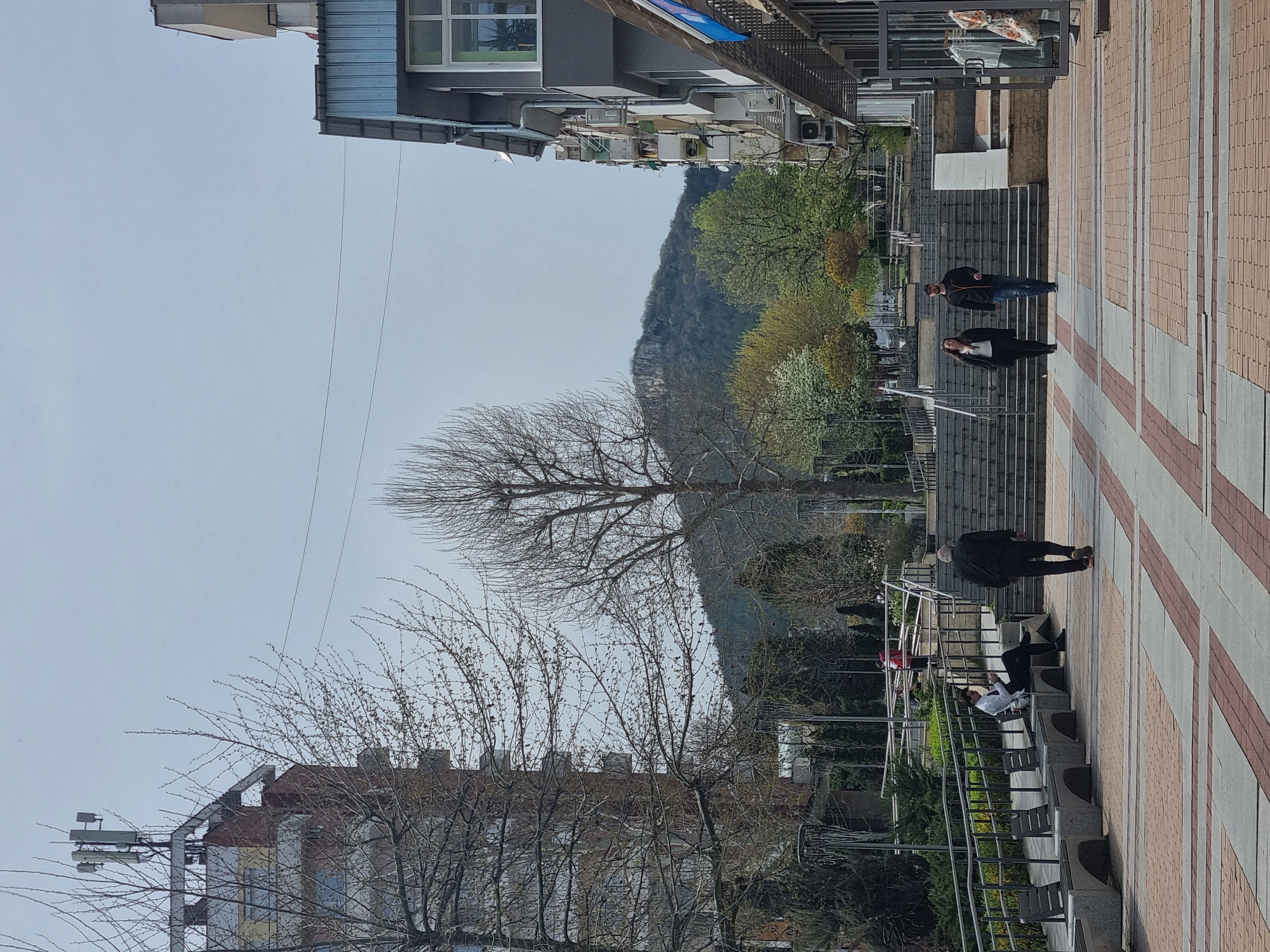 The image depicts a public square in Gorna Oryahovitsa, Bulgaria. The ground is paved with alternating light and dark stone. There are multiple people: Two people are walking up the steps away from the viewer. A person is sitting on one of the benches to the viewer's left. Another person is standing, also to the viewer's left. In the background are apartment buildings. Behind the buildings and square is a hillside. The sky is overcast.