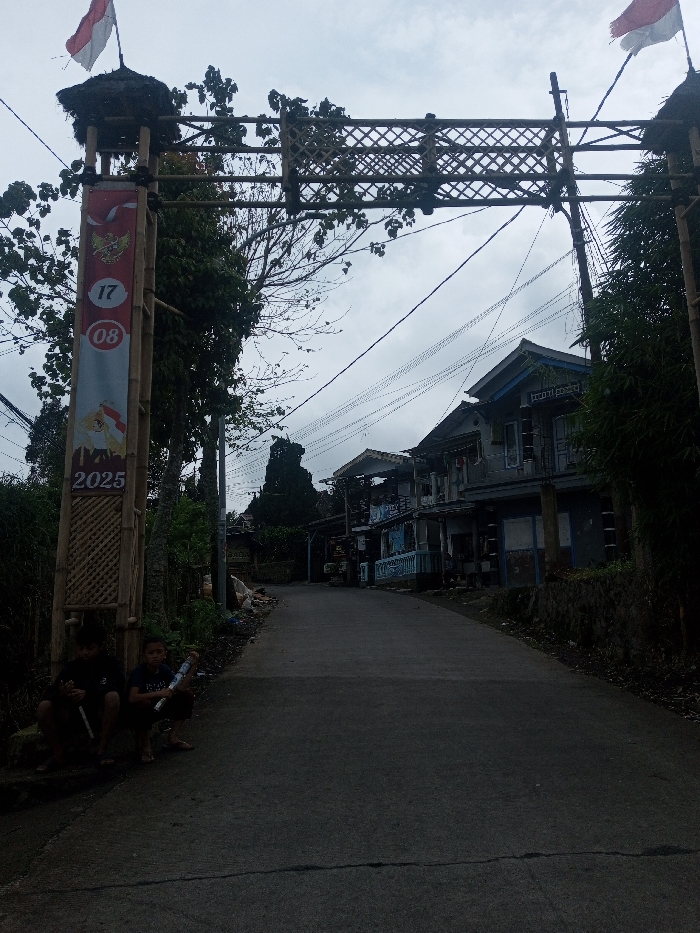 The image depicts a street scene under an overcast sky, featuring an asphalt road extending into the background. A decorative bamboo archway spans the road in the foreground, supporting two small red and white flags, which resemble the flag of Indonesia. A vertical banner is affixed to the left archway post, displaying the Indonesian Garuda Pancasila emblem, followed by the numbers '17 08' and '2025'. To the left of the archway, two young males are seated on the ground; one holds a long, light-colored cylindrical object. Along the right side of the road, several multi-story residential or commercial buildings are visible, showing various architectural styles and some visible wear. Trees and dense foliage border the road on both sides. Overhead power lines crisscross the sky. The scene is located in the city of Irupalai, Sri Lanka.