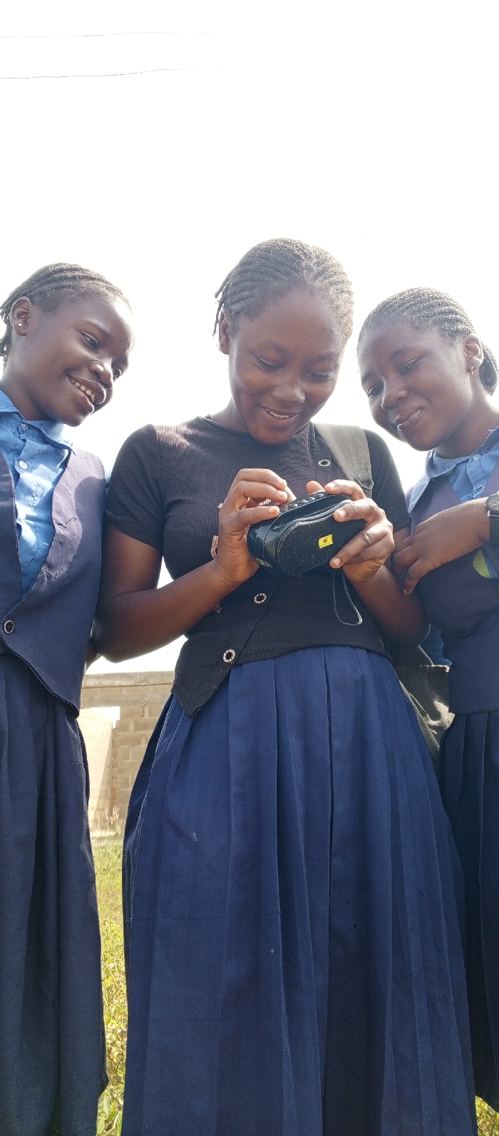 Three young females are depicted outdoors in Kakau, Nigeria, under a bright, clear sky. The central figure, wearing a dark short-sleeved top and a dark blue pleated skirt, holds a black portable electronic device, possibly a radio or speaker, featuring a mesh grille, controls on top, and a yellow label. She manipulates the device with her thumbs. A dark backpack strap is visible on her right shoulder. To her left, another female, dressed in a light blue shirt, dark blue blazer, and dark blue pleated skirt, smiles and looks towards the device. To the central figure's right, a third female, similarly dressed in a light blue shirt, dark blue blazer, and dark blue pleated skirt, also smiles and looks at the device; she wears a dark wristwatch on her left wrist. All three individuals have dark skin and braided hairstyles. In the background, behind the subjects, unfinished concrete block structures are visible above an area of green foliage and grass.