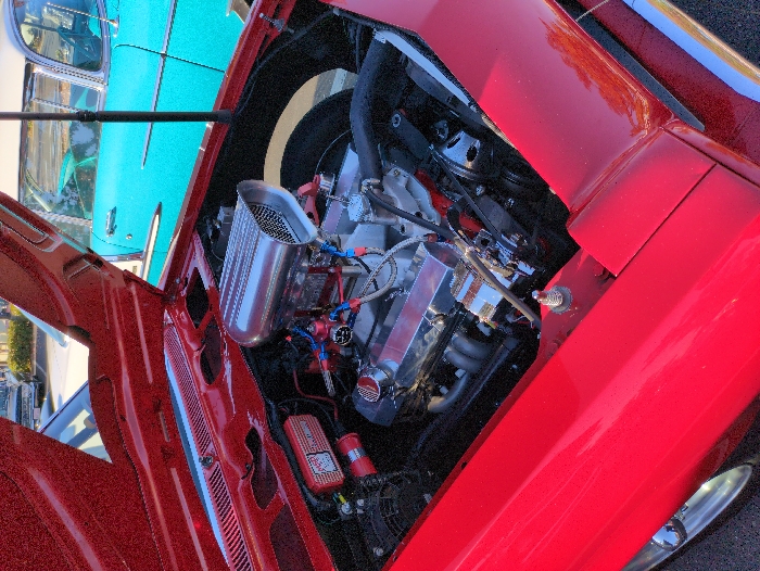 A detailed, high-angle view shows the engine bay of a glossy red, modified muscle car with its hood propped open, situated outdoors in Carmichael, United States