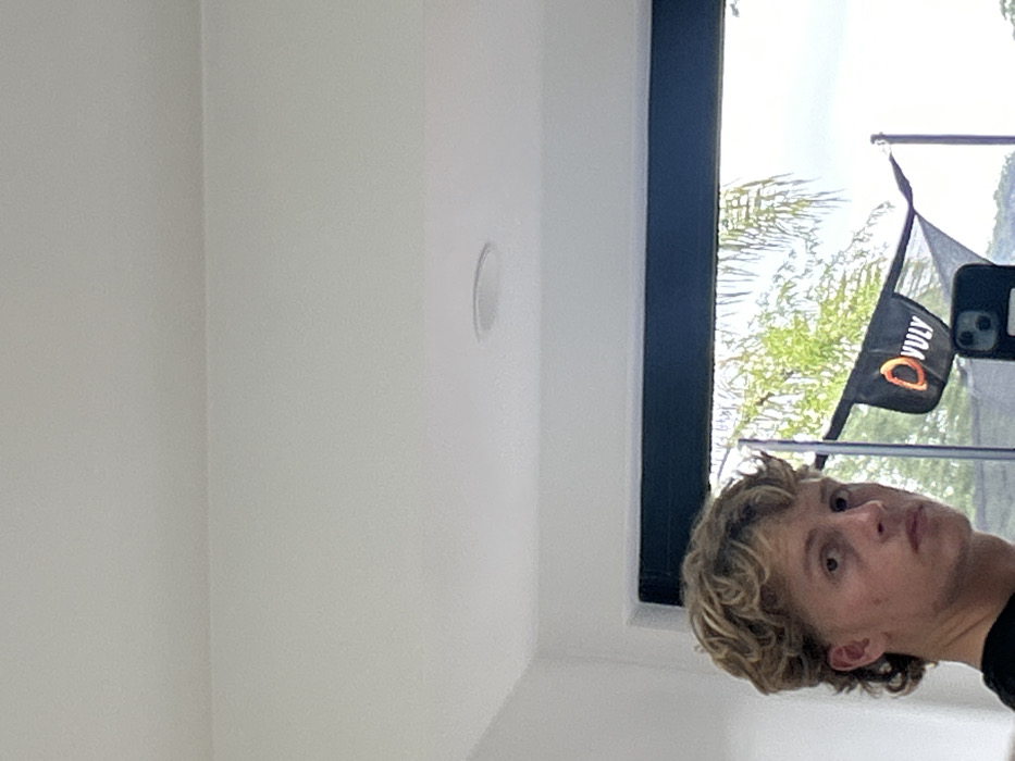 A person with curly blonde hair partially faces the camera, reflected in a window. The reflection also includes a black flag with the word "Vuly" on it. Outside the window, foliage is visible. The interior wall is white and features a circular vent or speaker.