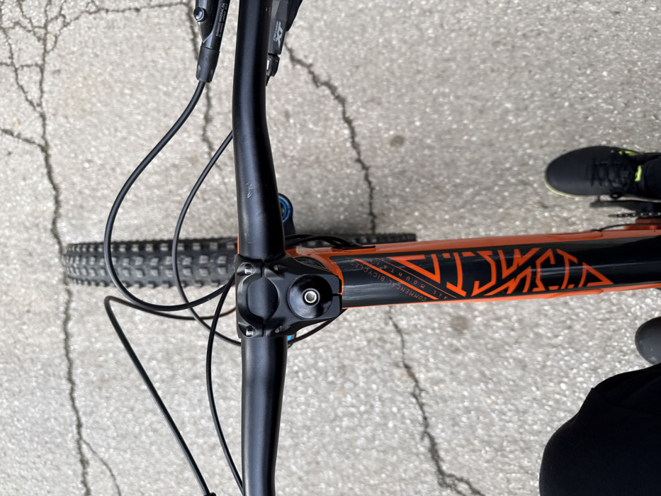 - "A first-person, downward-facing view captures the handlebars and upper frame of a black and orange Commencal "ALL MOUNTAIN" bicycle, situated on cracked light gray pavement in Cherven Bryag, Bulgaria" by FM-yYd9h2, licensed under CC BY 4.0