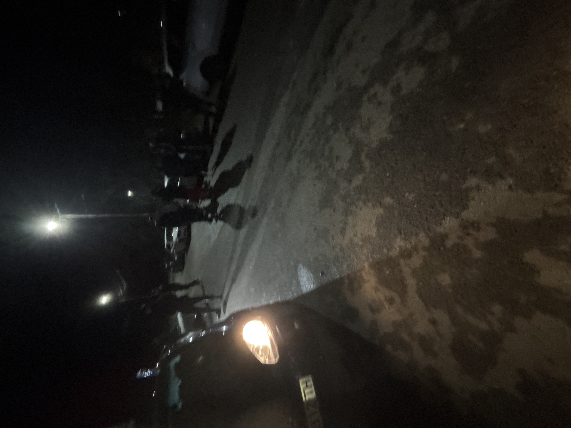 The image appears to be taken at night in Dabene, Bulgaria. A dark-colored car is parked on the side of a street, with its headlights illuminating the asphalt surface in the foreground. The car's license plate is partially visible. A group of people are standing on the sidewalk further down the street, near a street light that casts light onto the scene. The street is wet, and the shadows of the people are visible on the pavement. Several parked vehicles can be seen alongside the sidewalk.