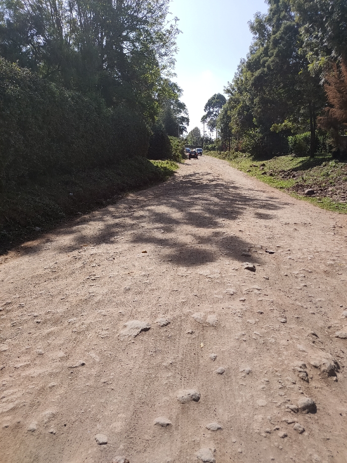 The image displays a dirt road in Ngong ward, Kenya, viewed from a low perspective
