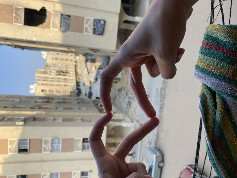 Two light-skinned hands form a heart shape in the foreground, positioned above a multi-colored striped towel (green, yellow, red, white) draped over a railing with black wires. The background reveals a devastated urban environment in the city of Unknown, Unknown, under a clear blue sky. A street or alleyway is visible directly below, featuring a light blue sedan and a partially visible red vehicle. A blurred human figure walks on the street in the distance. The ground is covered in dust and scattered debris. Multi-story residential buildings, light beige with brown accents, line the street. The building on the immediate right exhibits a large, irregular hole on an upper floor, indicative of significant structural damage. Further into the background, numerous multi-story structures are observed amidst extensive rubble and collapsed sections, consistent with widespread destruction in a residential area, illuminated by daylight.
