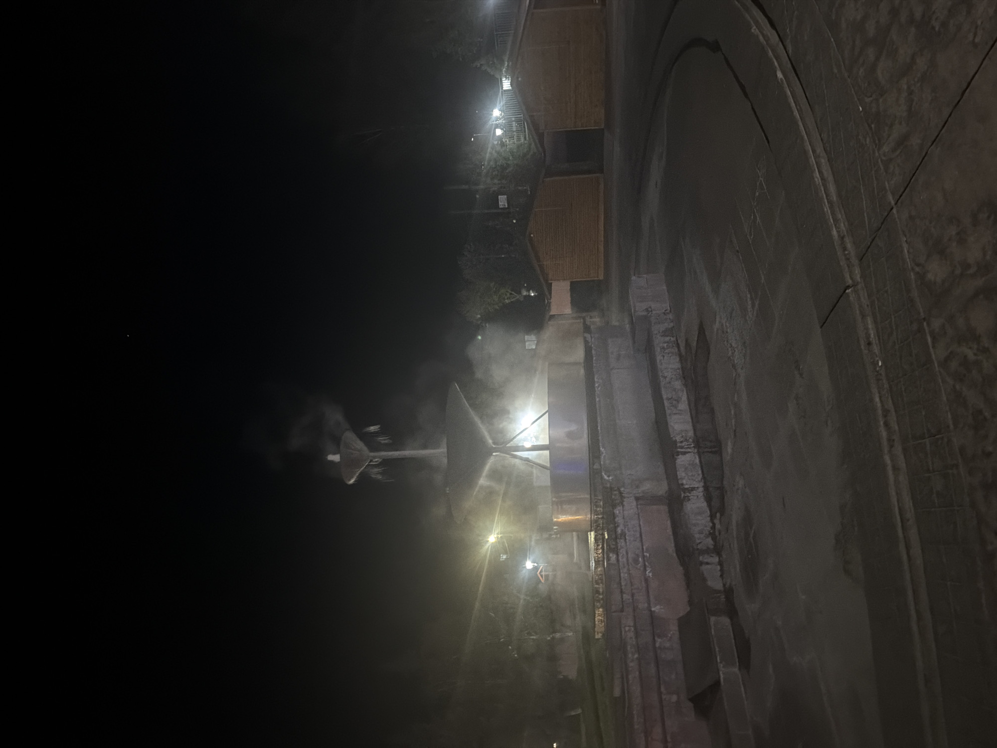 The image depicts a night scene in Sapareva Banya, Bulgaria, featuring the town's prominent geyser and surrounding infrastructure. A large metallic structure, likely a viewing platform, is partially visible in the foreground, constructed of dark gray stone or concrete. Mist or steam rises from the geyser, illuminated by nearby streetlights. In the background, traditional wooden structures with peaked roofs are also illuminated, indicative of tourist accommodations or shops. The overall environment is dark, with artificial light sources defining the scene.