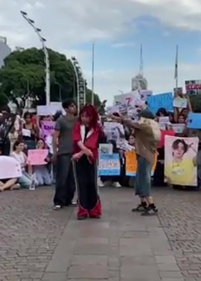 Three young adults are performing a dance routine in front of a crowd on a cobblestone plaza. The dancer on the left has red hair and wears a red jacket and black pants, while the dancer in the middle wears a grey shirt and black pants. The dancer on the right wears a tan jacket, blue shorts, and a hat. The crowd consists of young people holding signs with images and text, seemingly related to a musical group. The background shows city buildings, streetlights, and a cloudy sky.