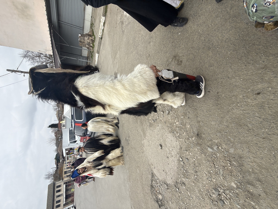 The scene depicts an outdoor gathering on a worn street in Zidarovo, Bulgaria, under an overcast sky. In the immediate foreground on the right, a person is partially visible, wearing black robes and black shoes. Adjacent to them, a central figure in the mid-ground stands facing left, clad in a full-body shaggy costume predominantly black on the back and white on the front, arms, and lower legs. This individual wears white Adidas sneakers with black stripes and holds a dark, possibly wooden, object resembling a club or staff with a metallic cap, upright in their right hand. Further left in the mid-ground, a group of individuals also wear similar shaggy fur costumes. One prominent figure wears a white fur costume with black accents and a dark blue conical hat, facing slightly left. Next to them is another person in a black fur costume with white accents. A smaller individual, possibly a child, is visible in a white fur costume, facing away. Additional figures in the background, some in similar attire and others in regular clothing, suggest a crowd. The street surface is a mix of asphalt and compacted dirt, showing significant wear, cracks, potholes, and scattered small stones. In the background, low-rise buildings with aging architecture line the street, some appearing to be storefronts with visible rolled-down shutters, and others residential. Several parked vehicles, including a dark SUV and a white utility van, are present. A utility pole with wires is visible on the right, near a building with a tree stump beside it.