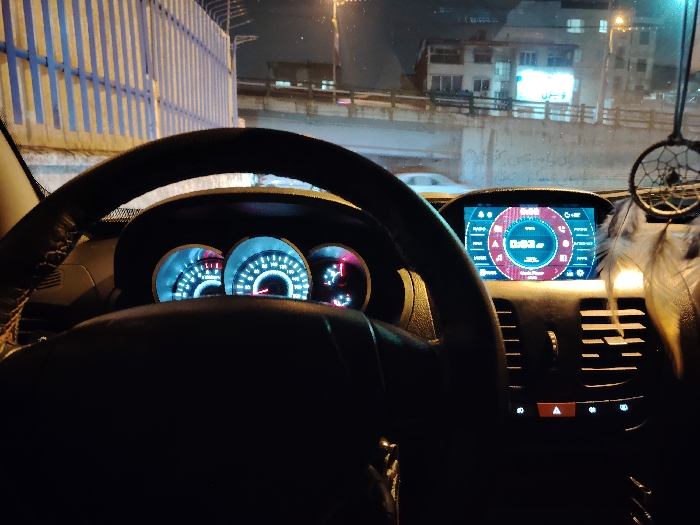 The image showcases the interior of a car at night. The steering wheel dominates the foreground, with illuminated dashboard gauges and a digital display visible behind it. Outside the car, a street scene with buildings and elevated roads can be discerned under dim lighting. A dreamcatcher hangs from the rearview mirror. The overall impression is a nighttime drive, possibly in an urban area.