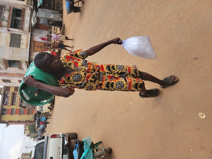 A young male, appearing to be a pre-teen, with dark skin, walks on an unpaved, light brown dirt street in Onitsha, Nigeria. He wears a short-sleeved, collared shirt and matching shorts patterned in black, yellow, and red, paired with dark slide sandals. He carries a large, green LPG cylinder on his right shoulder and a translucent white plastic bag filled with ice or a clear substance in his left hand. His gaze is directed towards the camera. In the background, a white pickup truck, identifiable as a Toyota Tacoma, is partially visible on the left, parked near a green wheelbarrow containing a blue tarp. Further into the distance, several multi-story buildings with faded yellow, orange-red, and light grey facades line the street, some showing signs of weathering and balconies. Multiple pedestrians, including other children and adults, are visible walking in the mid-ground. Another wheelbarrow is partially visible on the far right. The sky overhead is bright and overcast.