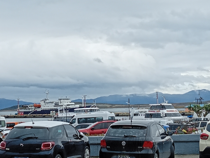A cloudy sky hovers over a waterfront scene with multiple boats docked. Several cars fill the foreground, parked along a grey wall. A larger, multi-level boat is prominent behind a series of smaller white passenger vessels. Hills rise in the distance, partially obscured by the overcast conditions. The overall scene conveys a sense of a harbor or coastal town on a cloudy day.